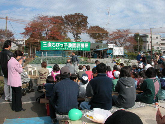 | ― ちびっ子農園、秋の収穫祭から ― 2003.11.23(日) 東京でも紅葉の便りが聞かれるようになった。ちびっ子農園秋の収穫祭は毎年、勤労感謝の日と決まっている。天気は晴れ、風もあまりなくまずまずの収穫祭日和となった。ちびっ子たちも大勢参加し、餅つき、トン汁、焼きソバ、焼きさんま等を味わった。青空の下での、手作りの料理の味わいは格別である。 |